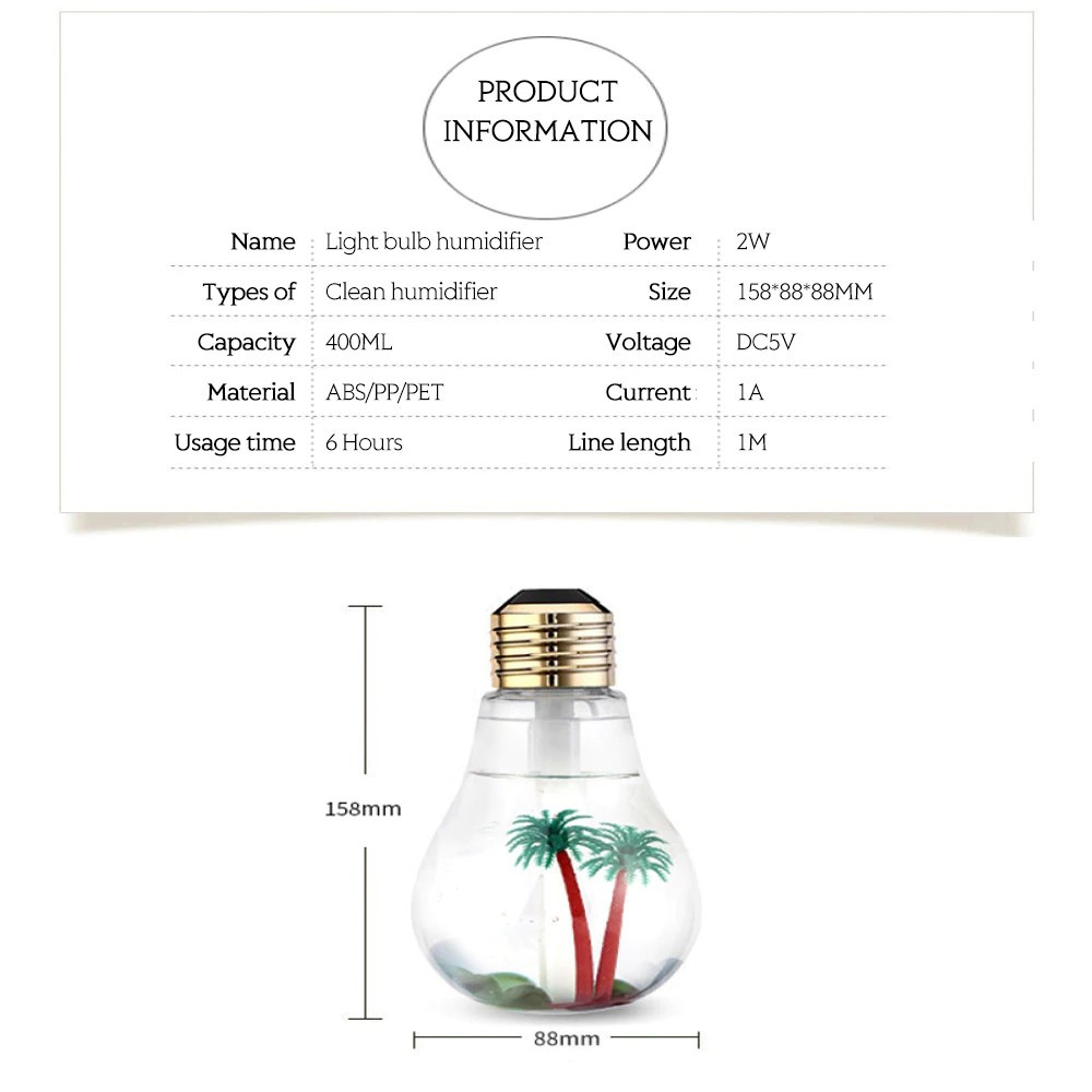 7 Color Changing 400ml LED Lamp Air Ultrasonic Humidifier Essential Oil Diffuser Atomizer Freshener Mist Maker Night Light Bulb LED Lamp Humidifier Size: 153*88*88(cm) Water tank: 400ml USB wire: 1.5 meter timing: 6 hours LED light: 7 Color Changing LED light Function: Humidification,air freshener Purchase